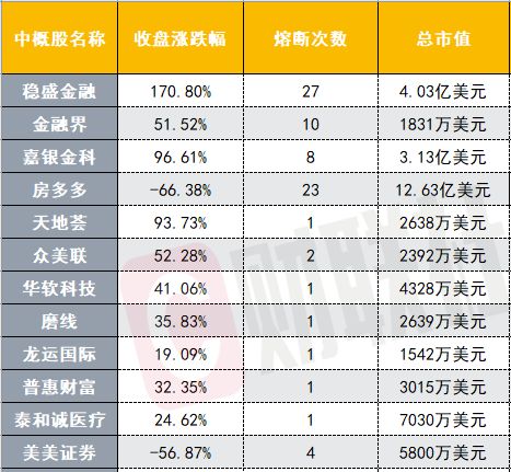 据财联社不完全统计,昨夜,中概股至少上演了80次熔断,熔断次数最多的当属稳盛金融,该股共熔断27次,房多多上演了23次熔断。