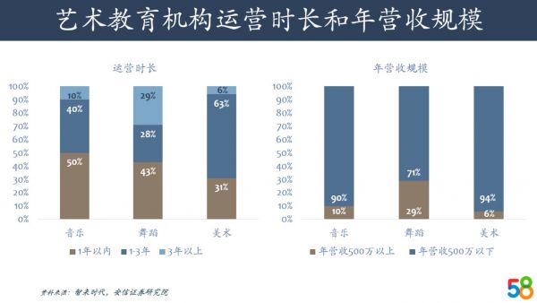 · 就集中度而言,线下的教育机构虽然发展时间长,但依然较为分散,仅出现少数规模化的教育机构。我国艺术教育机构中,仅有不到20%的机构可以做到年营收破500万元。并且运营时间多半是3年以下,且还有50%为1年以下