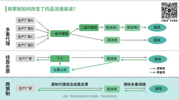 以「两票制」为例。它于 2016 年开始试行,2017 年在全国推进,2018 年底之前在所有中国公立医疗机构实行。两票制缩短了药品从药厂到医院之间的中间环节,摆脱了经销商们的层层盘剥之后,层层加价的机会少了。