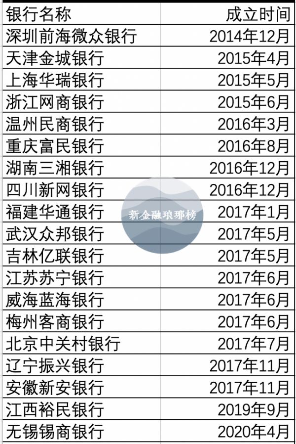 到目前为止,银保监会共批复筹建了19家民营银行,其中2014-2016年批设17家,2017-2018年无一获批,直到2019年再次开闸,江西裕民银行与无锡锡商银行拿到批文。