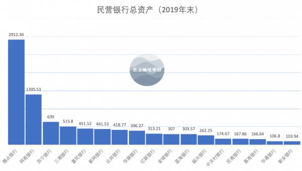 截至2019年末,微众银行总资产接近3000亿元,遥遥领先于同业;排在第二位的是网商银行,总资产1395.53亿元,也是仅有的两家规模超过千亿的民营银行。