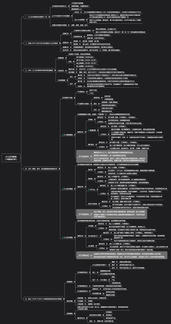 线上发展期(2018年以后):1)产品形态更加丰富,出现更具经济效益的互动录播课,出现配套的教学素材盒子,让学生既有互动的乐趣,也有动手实操的乐趣;2)更多的玩家涌入,包括跨学科玩家—技能教育转向综合素质化,和传统线下教育机构—OMO趋势;3)技术赋能教育,如AI智能互动课为代表的轻课型兴起、直播陪练中的鱼眼摄像头配合AI技术,可以实时反馈、纠错,进一步提升教学效率;4)政策明朗,支持艺术教育行业,如2018年的《民促法-送审稿》中一系列的支持