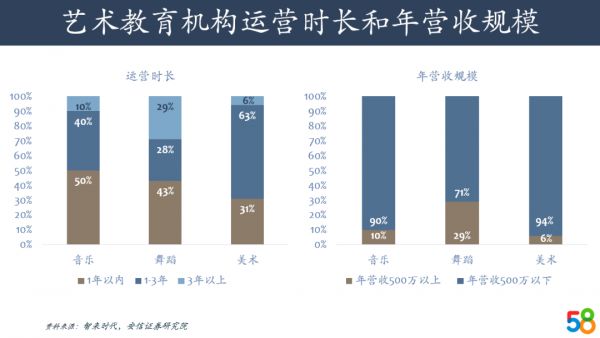 就集中度而言,线下的教育机构虽然发展时间长,但依然较为分散,仅出现少数规模化的教育机构。我国艺术教育机构中,仅有不到20%的机构可以做到年营收破500万元。并且运营时间多半是3年以下,且还有50%为1年以下