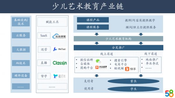 如上图所示,艺术教育产业链有着主链条和支持辅助模块: