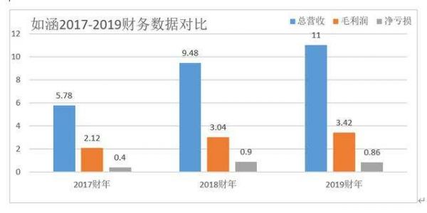 2017-2019财年,如涵录得营收分别为5.78亿元、9.48亿元及11亿元,同期毛利润分别为2.12亿元、3.04亿元及3.42亿元。