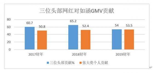 截止2020Q1财报,期末如涵共签约168个KOL,其中头部KOL仅有张大奕、大金、莉贝琳三人。在这三人之中,张大奕贡献的GMV远超其他两人,占如涵总GMV的一半以上。