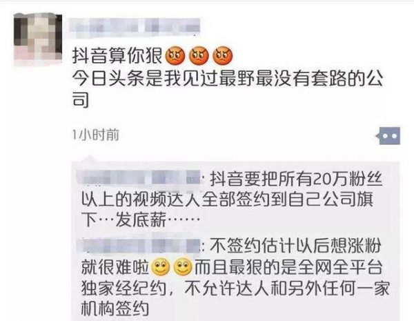 早在2018年春节抖音爆火之后,便有消息称,今日头条用涨粉威胁所有抖音20万粉丝以上的达人,把它们用“底薪+补贴”捆绑在平台,规定签约达人不能和其他公司再缔新约。