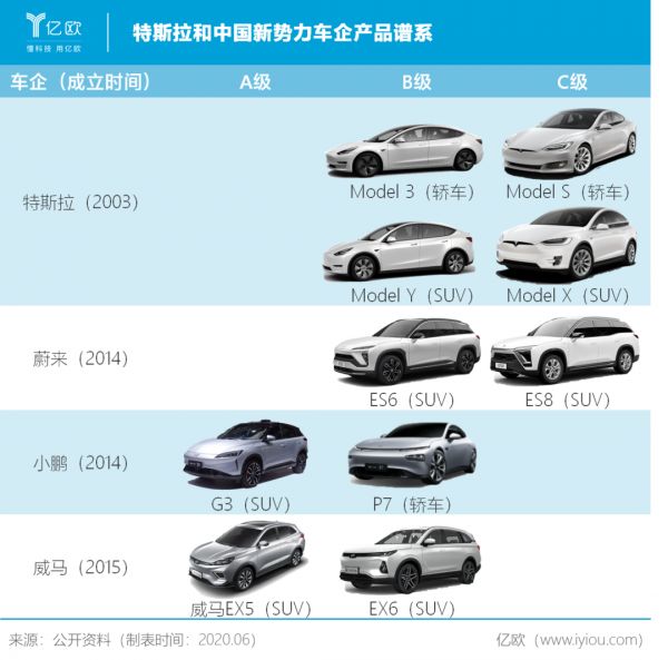 “特斯拉产品谱系覆盖比较完整。”郑赟解释道。除了跑车Roadster外,特斯拉目前已上市的四款量产车涵盖了B级、C级的轿车和SUV,满足范围更广的消费者需求。蔚来、小鹏和威马,由于成立时间较短,各自均仅发布两款量产车。同时,除了小鹏P7外,其他车型都是SUV,受众面较小。