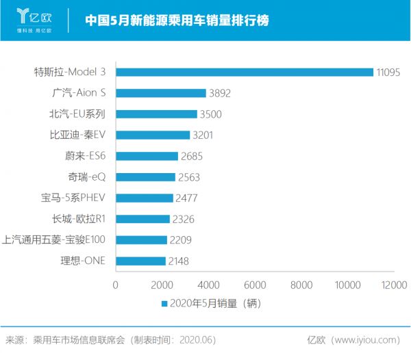 5月,特斯拉Model 3销量再次破万,达到1.1万辆,市场份额高达16.2%,遥遥领先排名第二的广汽Aion S的0.4万辆。而在中国造车新势力中,仅蔚来ES6、理想ONE挤进前十榜单。