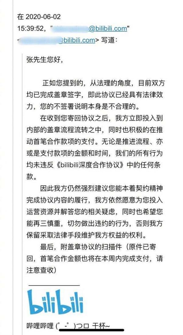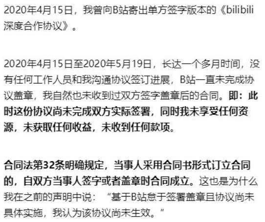 6月15日凌晨4点,B站发布对"巫师财经"的澄清说明做出回应,B站表示,"从法理的角度,目前双方均已完成盖章签字,即此协议已经具有法律效力,在收到您寄回协议之后,无论是推进流程、亦或是支付款项的金额和时间,我们的所有行为均未违反《 bilibili深度合作协议》中的任何条款。"