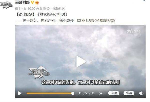 6月14日上午,"巫师财经"发布了退出B的声明。在其微博上发布的告别视频中,"巫师财经"表示,自己此前从未有任何商业化,而近期在B站"用爱发电"所做的视频效果反馈不及预期,自己在思考靠热情做入门科普的模式是否可持续。