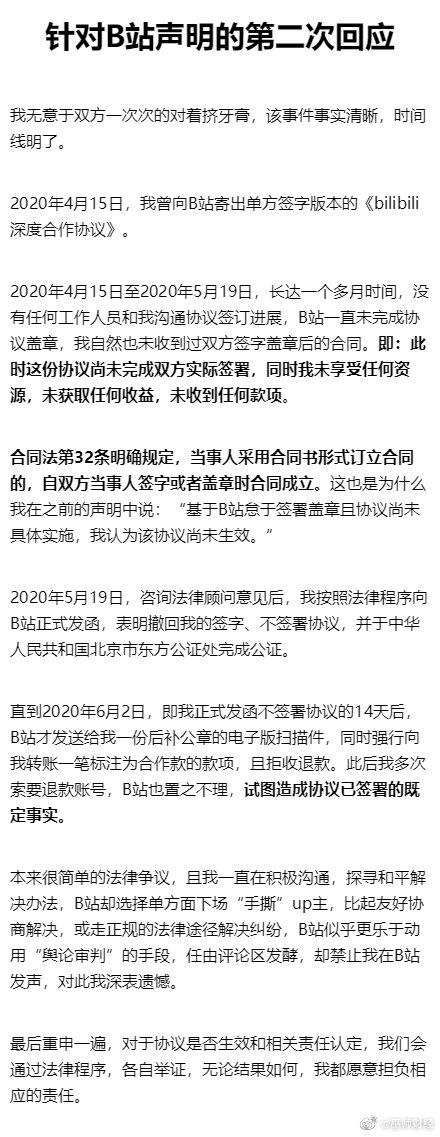 6月15日上午9点,"巫师财经"发布针对B站声明的第二次回应。回应中表示自己曾于4月15日向B站寄出单方签字版本的《bilibili深度合作协议》,由于未收到双方签字盖章后的合同,5月19日其向B站发函撤回签字、不签署协议,并在5月20日做出公证。6月2日,收到B站一份后补公章的电子版扫描件,并强行付款,款项不能被退回。