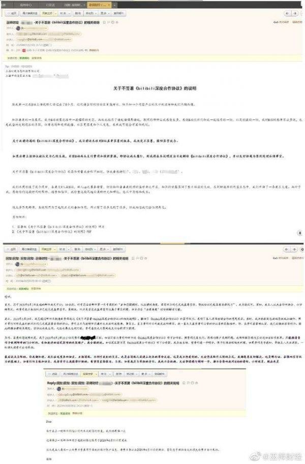 6月15日凌晨,"巫师财经"在微博发布针对B站公告的澄清说明,称与B站从法律上并未建立合同关系,会通过法律程序各自举证。而B站则是晒出已完成盖章和签字的《bilibili深度合作协议》和双方沟通邮件,并表示协议已经具有法律效力。