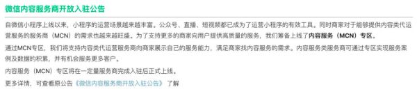 Tech星球(微信ID:tech618)独家获悉,微信近日发布《微信内容服务商开放入驻公告》,该公告介绍,微信筹备上线了内容服务(MCN)专区,该专区支持内容类代运营服务。这也是微信首次公开邀约MCN机构入驻,意味着微信商业化在服务端又进了一步。