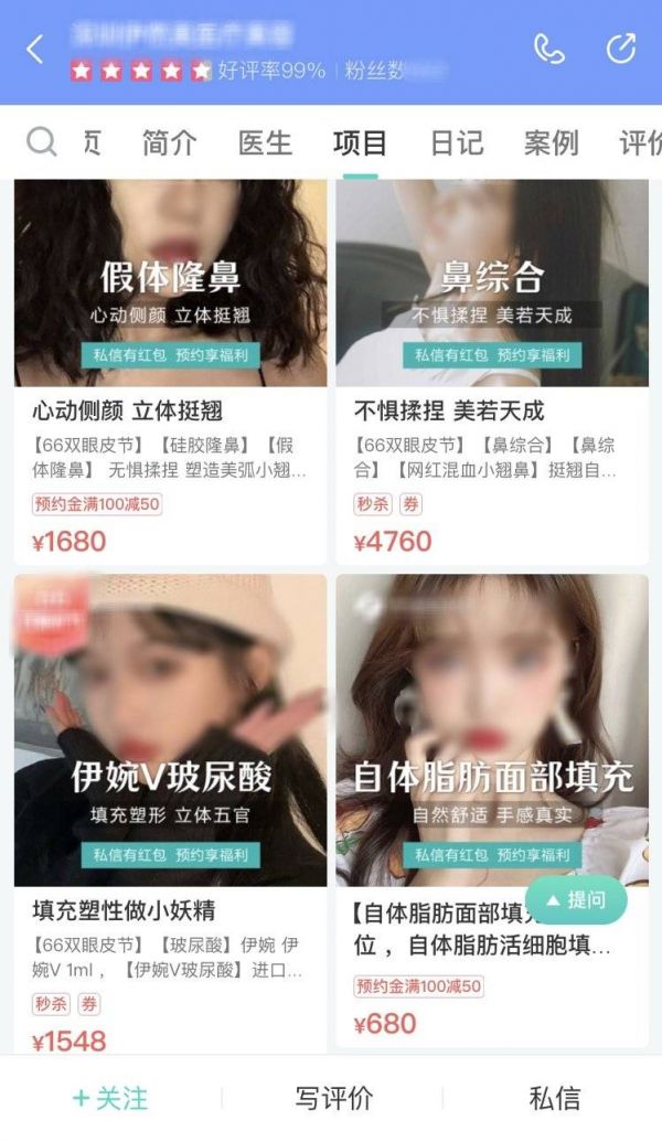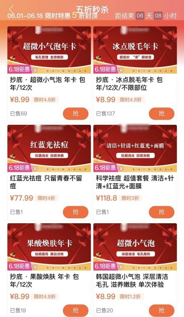 在某点评APP上,许多商家更是大力促销,推出多个超低价轻医美套餐来吸引顾客。例如:一项清洁毛孔的超微小气泡项目单次体验价低至8.99元,12次冰点脱毛项目总价8.99元等。