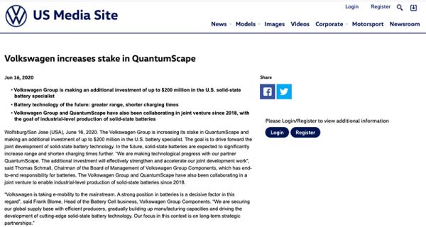 ▲大众汽车发布公告确认增资QuantumScape