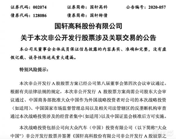 ▲国轩高科发布公告确定大众入主