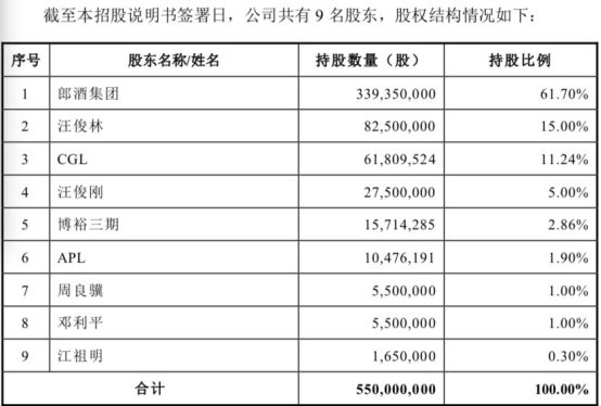 如今,伴随自称“两大酱香型白酒之一”的郎酒走向台前,隐秘在背后的郎酒掌门人也揭开了神秘面纱。根据招股书,郎酒集团董事长汪俊林为公司实控人,前五大股东分别为汪俊林控制的郎酒集团、汪俊林、CGL、汪俊刚(汪俊林兄弟)与博裕三期。