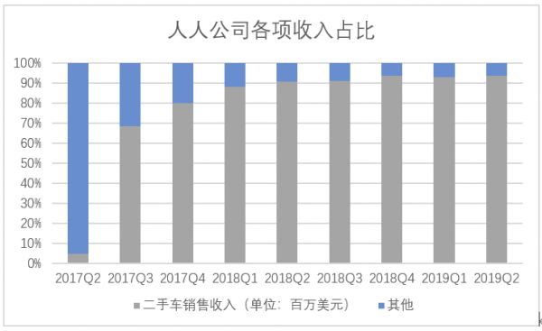 虽然在公司官网的介绍中,人人公司“聚焦行业互联网,围绕房地产、汽车两大领域,业务板块主要包括二手车业务、海外SaaS业务”,但从财报中可以看出,2018年11月14日,人人公司以2000万美元将人人社交网络全部资产出售给北京多牛互动传媒股份有限公司后,其营收来源日渐单一,几乎是一家纯二手车公司。