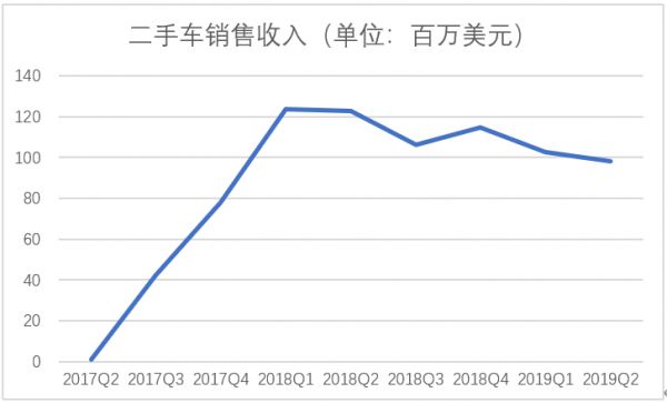 以2019年二季度数据为例,开心汽车该季度销售量为1667辆,二手车销售营收9830万美元;同类美股上市企业优信二手车该季度总销量64161辆,二手车销售营收5680万美元。