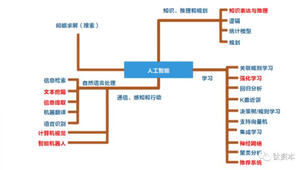 下图中画红线的部分是近期和投资有关的领域,包括文本识别、信息提取、语音识别、计算机视觉、机器人智能,深度学习和神经网络的学习、知识表达推理、知识图谱等,这些看起来量很大,但是实际上与投资有关的并不多。