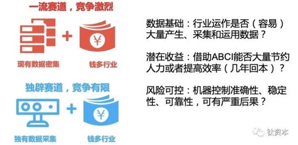 AI和传统行业的关系是AI+传统行业。有两类企业:第一类就是已经确定的技术成熟领域的浅层次应用,特点是竞争极其激烈,因为数据很密集、客户资金充足,但是僧多粥少、不好切入;很有投资价值的一种就是独辟赛道的公司,他们在布置项目层级的时候采集了很多独有的数据,一旦采集足够多以后,就会形成垄断性,不过这种情况不太容易出现,一旦出现,就有独角兽潜质。