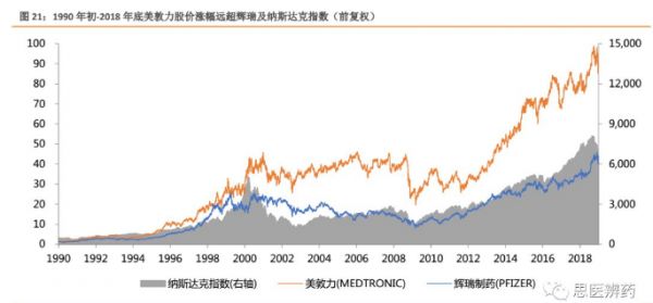 从股价角度来看,辉瑞在1990年初的股价是1.25美元,美敦力为1.43美元,而2018年底的股价,辉瑞是43.27美元,美敦力为90.96美元,美敦力28年的投资复合收益为16%,而医药复合收益为13%,投资优质器械公司的收益不输于优质医药企业,甚至更高。