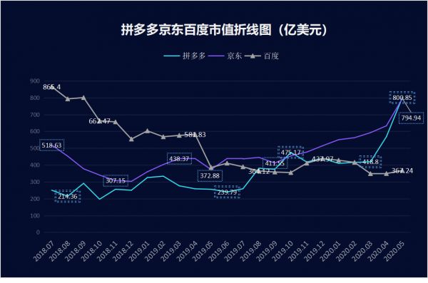 将时间单位拉长至月可清晰看到,2019年8月是拼多多市值增长的第一个关键节点,市值首次超越百度;同年10月,拼多多市值首次短暂超过京东,随后又跌至京东之下;直至2020年2月,拼多多股价一路高走,市值排位长期保持在百度之上,并且到同年5月再次超越京东。