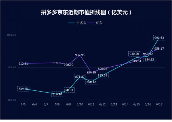 梳理拼多多近半个月股价,其市值呈直线攀升的节点发生在6月11日。当日,拼多多收跌1.77%,市值为856.42亿元。自此之后,拼多多股价便呈现一路向上趋势,直至市值突破千亿美元。