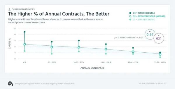 除此之外,相比按月付费的方式,年付费还可以降低客户流失率。我们可以将客户流失分为三个阶段,分别是早期流失(客户处于产品试用期)、中期流失(客户处于稳定使用期)、晚期流失(客户处于需求提升期)。在客户处于不同阶段时,SaaS公司都有不同的手段去降低流失率,但每一种手段都需要花费时间和金钱成本,因此很难在每个阶段都做到完美。对于月付费的客户群体来说,由于客户的替代成本以及锁定周期较短,因此在每个流失期都会流失的可能;对于年付费的客户群体来说,由于有足够长的产品使用时间和锁定期,厂商大部分情况下有充分的时间使客户度过前两个流失期,最后剩下需要考虑的就是晚期流失,因此也会极大地降低流失率。