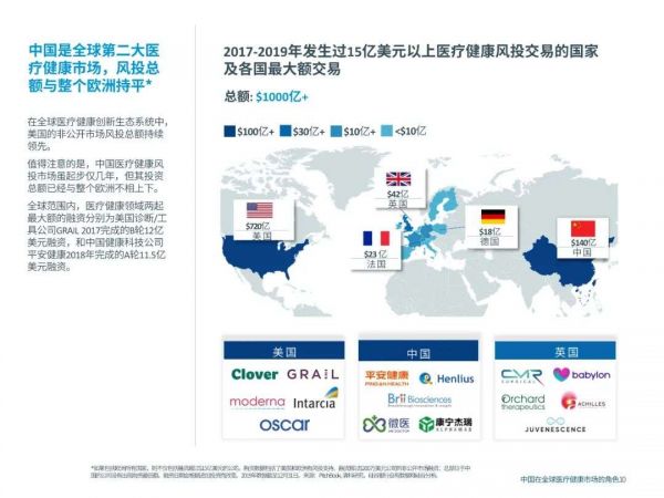 2019年,中国已经是全球第二大医疗健康市场,风投的投资总额与整个欧洲地区不相上下。2019年,中国医疗投资总额为63亿美元左右,较2018年创纪录的投资总额相比略有下降,而美国医疗投资创下了高达259亿美元的新纪录。