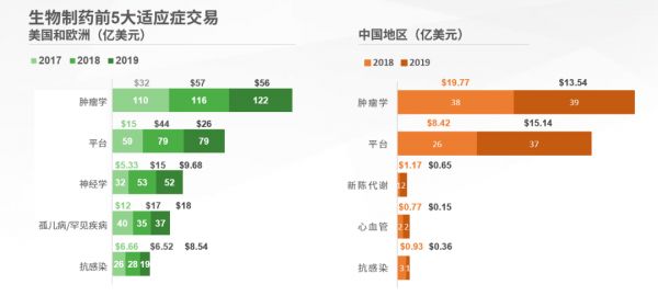从适应症排名上来看,中美的细分也很相似,肿瘤和平台类公司在总金额及数量上都牢牢占据前两名,但值得注意的是,在美欧市场肿瘤领域2019年的交易总金额和数量较2018年都出现了略微下滑,或是持平,而更为关注中枢神经类以及罕见病的其他适应症类型。然而,在我国2019年的医药类的投资仍然高度集中在肿瘤和平台类公司,其他领域均只呈现为个位数的投资。考虑到过去几年在肿瘤免疫方面的集中投资,越来越多的癌种将成为红海市场,后续的投资将趋于保守,众多投资人将期待商业化的进程。在过去一年间,全球在抗病毒/抗感染领域的突破不多,导致交易热情明显下降。随着新冠疫情的爆发,资本将再次重视病毒感染类疾病,呼吸道感染疾病,以及新型抗生素药物的研发。我们也期待国内投资人在未来一两年能关注新的适应症领域或是新靶点的发现,投资细分赛道能形成百花齐放的局面。