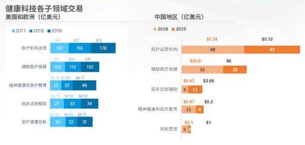临床试验辅助领域,是2019年难得在无论是交易数量还是融资额上都超越2018年的领域,这块也得益于生物制药板块的发展,刺激了加速药物发现和临床数字化解决方案的诉求。在美欧市场值得注意的是,2019年的A轮投资事件里,虽然医疗机构运营和辅助医疗保健还是头两个活跃的领域,但是第三活跃的领域已经是精神健康和医疗教育类公司,包括如何使用虚拟现实技术培训医疗机构。这类领域的投资在中国还是比较少见,我们也期待投资人在这个领域更多的关注。