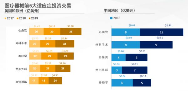 美国方面,尽管2019年心血管器械子领域的交易量依然领先,但外科手术领域且以手术机器人为代表的子领域目前是非常引人注目且拥有巨大市场空间的,例如最近的手术机器人公司的较大融资事件(如:Procept),以及强生对Auris Health总额57.5亿美元的收购,我们预测这也将带动国内新一波对手术机器人的关注和投资热潮。在中国地区,影像子领域的投资数量也在增加,专门从事3D成像,增强分析所用的人工智能/机器学习,肿瘤可视化类的公司是投资的主要推动力量。