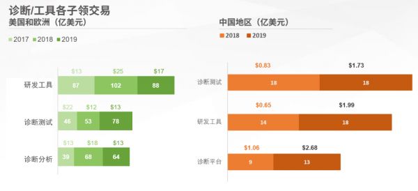 在美国,诊断/工具领域2019年出现了最大下滑,下滑幅度超过20%,主要原因是该领域的夹层融资(超过5000万美元)次数减少。投资额减少最大的领域在研发工具类,投资额减少了30%,交易量减少了14%。投资额减少在一定程度上与2018年创纪录的10x和Twist的上市前大宗融资以及Zymergen的近4亿美元的私募融资有关。