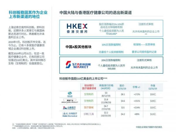 上交所科创板的迅速发展,巩固了其作为科创企业上市重要渠道的地位。整体来说,近两年中国二级市场所颁布的相关政策,对医疗板块非常利好:2019年7月开市至年底,有十余家医疗健康公司通过科创板上市,其中估值超过$10亿的有四家。