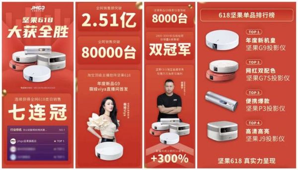此外,该公司提供的数据显示,618坚果投影仪全网销售额突破2.51亿,销售量突破80000台,位列投影品类第一,全品类连续获得全网618类目销售七连冠。在市场一片惨淡之际,这或许是为数不多的亮点。