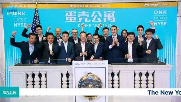 2020年1月17日,蛋壳公寓登陆纽交所,成为2020年纽交所第一中概股。敲钟时CEO高靖被簇拥在舞台中央,笑容满面。