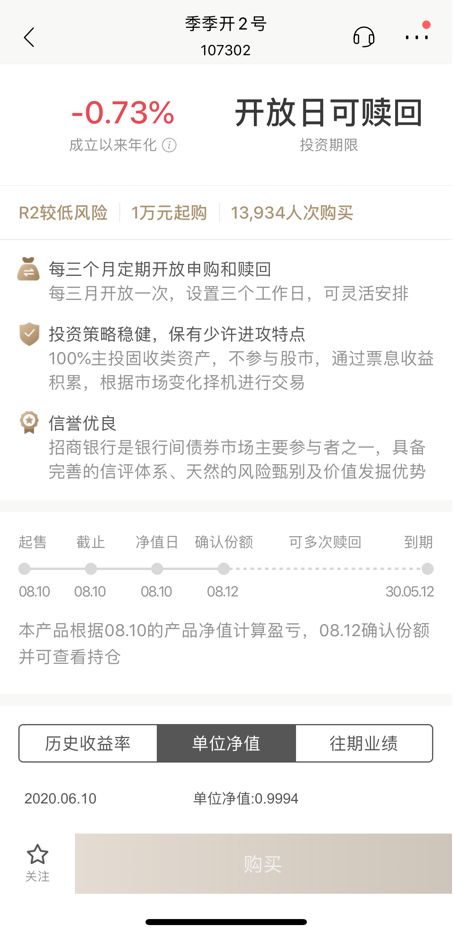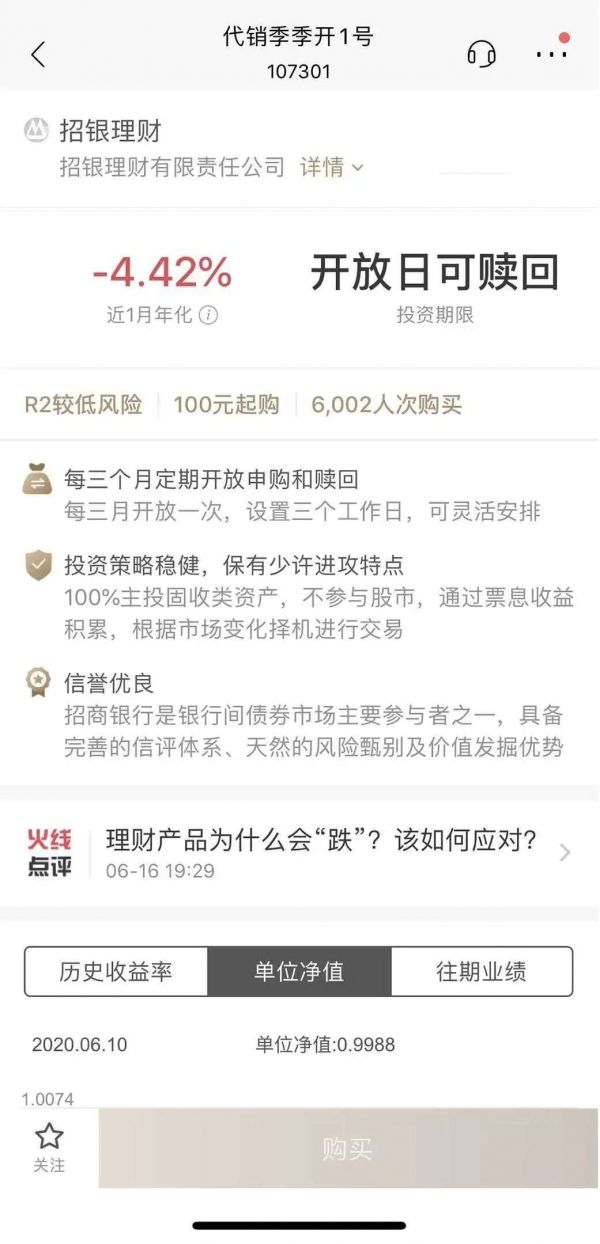 《棱镜》注意到,招行这款名为“代销季季开1号”的固定收益类产品,于4月17日成立,100元起购,风险等级为R2(较低风险),100%主投固收类资产,不参与股市,近1月年化收益为-4.42%;另一款“季季开2号”5月12日成立,成立以来年化-0.73%。