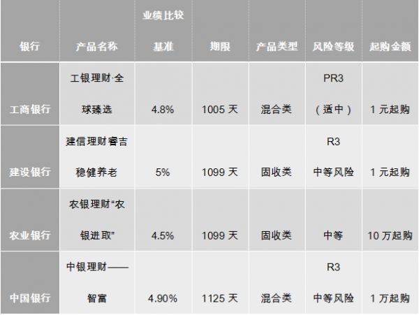 《棱镜》粗略统计了四大行在售的预期收益率最高的几款理财产品,均为三年期,风险等级为R3,业绩比较基准位于4.5%至5%之间。5%以上的理财产品已经难觅踪影。
