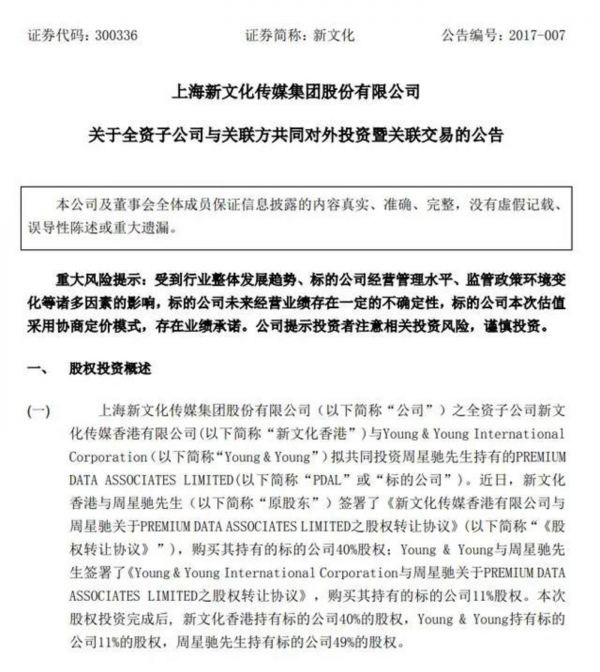 2017年1月,新文化发布公告称,旗下全资子公司新文化传媒香港有限公司(以下简称"新文化香港")和Young & Young International Corporation(以下简称"Young & Young")拟共同投资周星驰先生持有的PREMIUM DATA ASSOCIATES LIMITED(以下简称PDAL)。