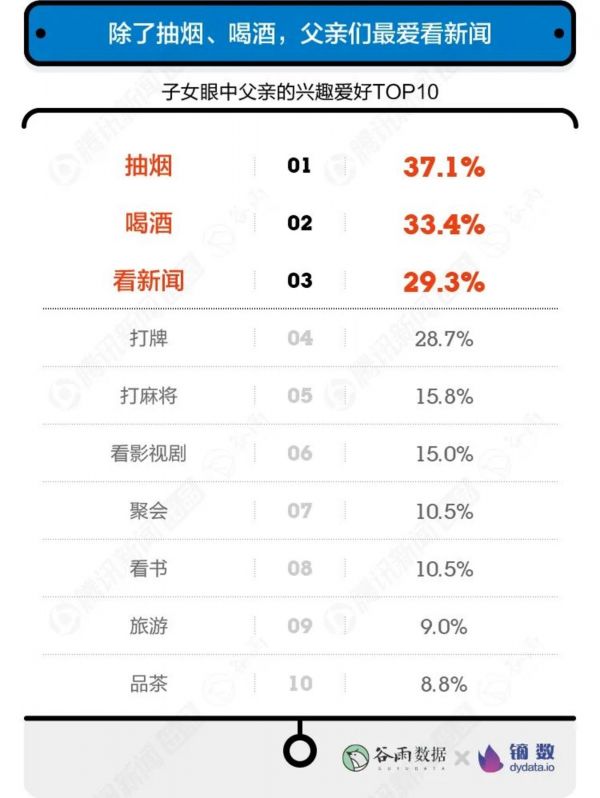 这传言有一半靠谱。现实生活中父亲们头烫得少,“看新闻”成第三大爱好。了解国家大事成了除抽烟喝酒外父亲们的标配。