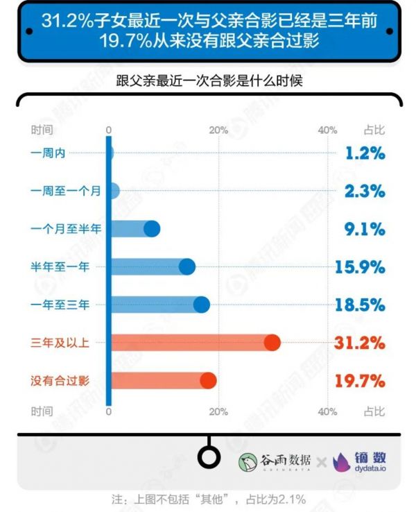 19.7%的子女从来没有跟父亲拍过合影,31.2%的子女最近一次与父亲合影已经是三年前。