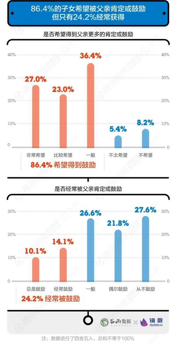 而在孩子面前,父亲似乎不擅长鼓励。超过八成的子女希望被父亲肯定或鼓励,但事实上只有24.2%的子女经常得到来自父亲的肯定或鼓励。