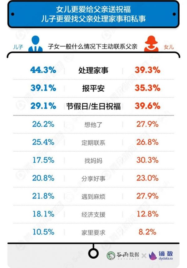 在处理家事和遇到私事时儿子最喜欢主动联系父亲寻求解决办法。而女儿主动找父亲更多是为了送上一份节日或生日祝福。