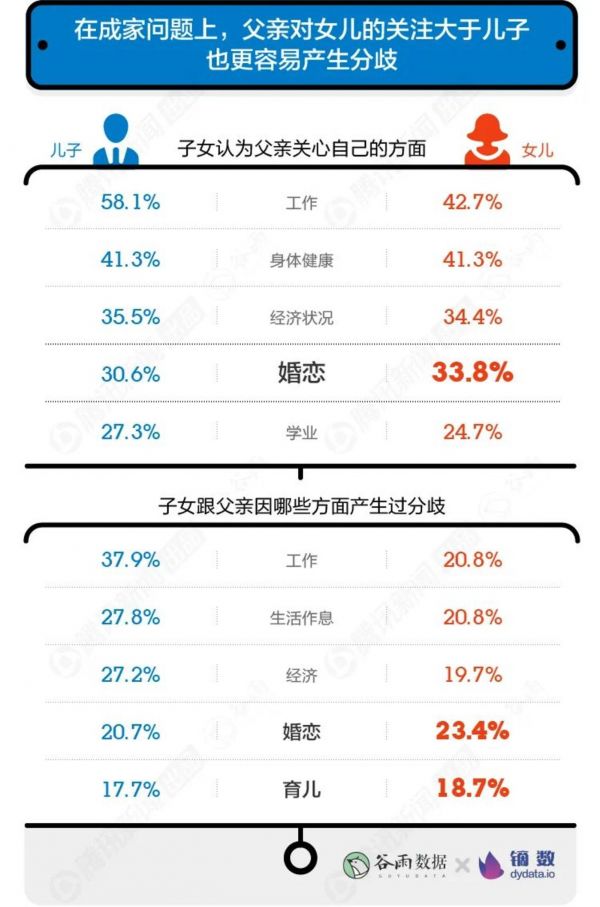 父亲最关注子女的是工作。而在找对象这件大事儿上,父亲们对女儿的关注度比儿子更高。在老父亲操心的各个方面中,婚恋问题是女儿唯一超过儿子的一项。