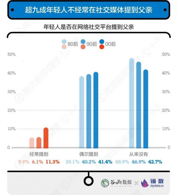 在年轻人的网络社交圈里,父亲总是个局外人。超九成年轻人不经常在社交媒体上提到父亲。超过一半的80、90后联系父亲的频率低于1个月一次,或许他们忙着联系“客户爸爸”的次数,比亲爸的次数还要多。