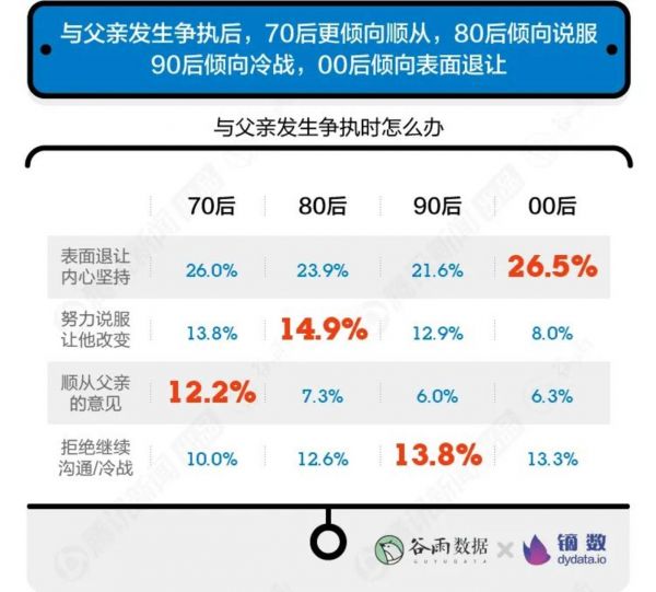 在几个年龄段中,70后更愿意顺从父亲,80后则倾向于努力说服,让父亲做出改变。而90后选择冷战意向最多,聊不下去就挂机,说了不听就不联系。