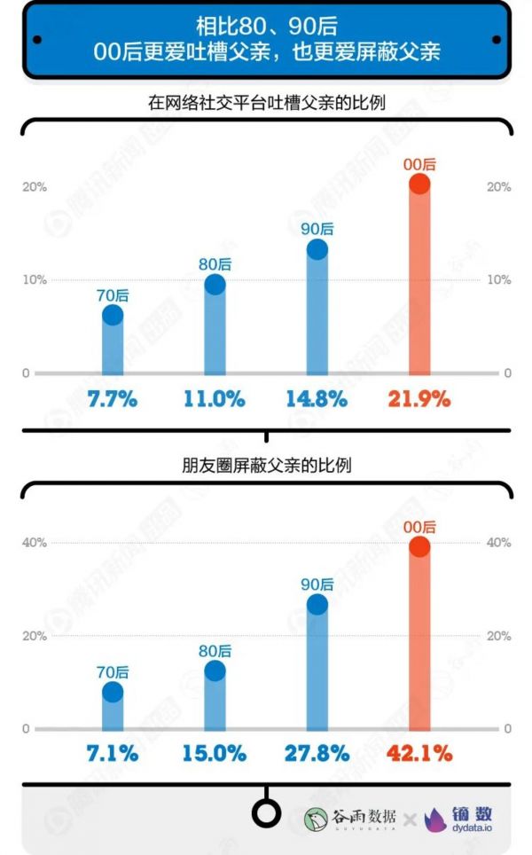相比之下,00后联系父亲更多。不过,他们也更爱在网上吐槽父亲或是屏蔽父亲。