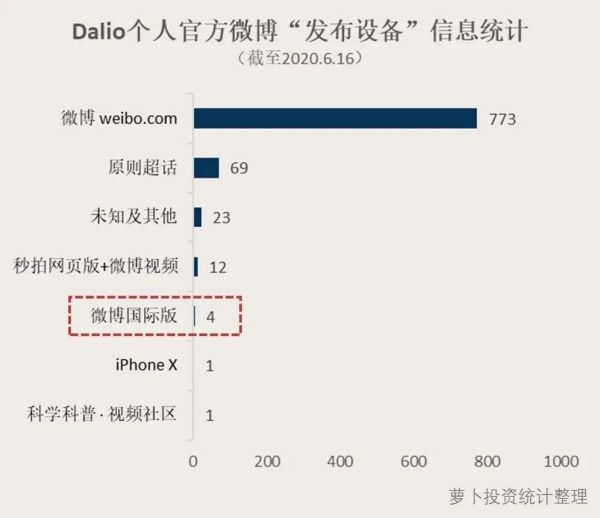 Dalio微博加V的帐号名称是 “瑞达利欧”,从2018年4月26日到2020年6月16日,他共发布了883条内容。通过微博“发布设备”数据显示,该账号有733条来自“微博 weibo.com”,仅4条内容的发布设备为“微博国际版”,还有23条为未知及其他途径,1条来自iPhone X等。
